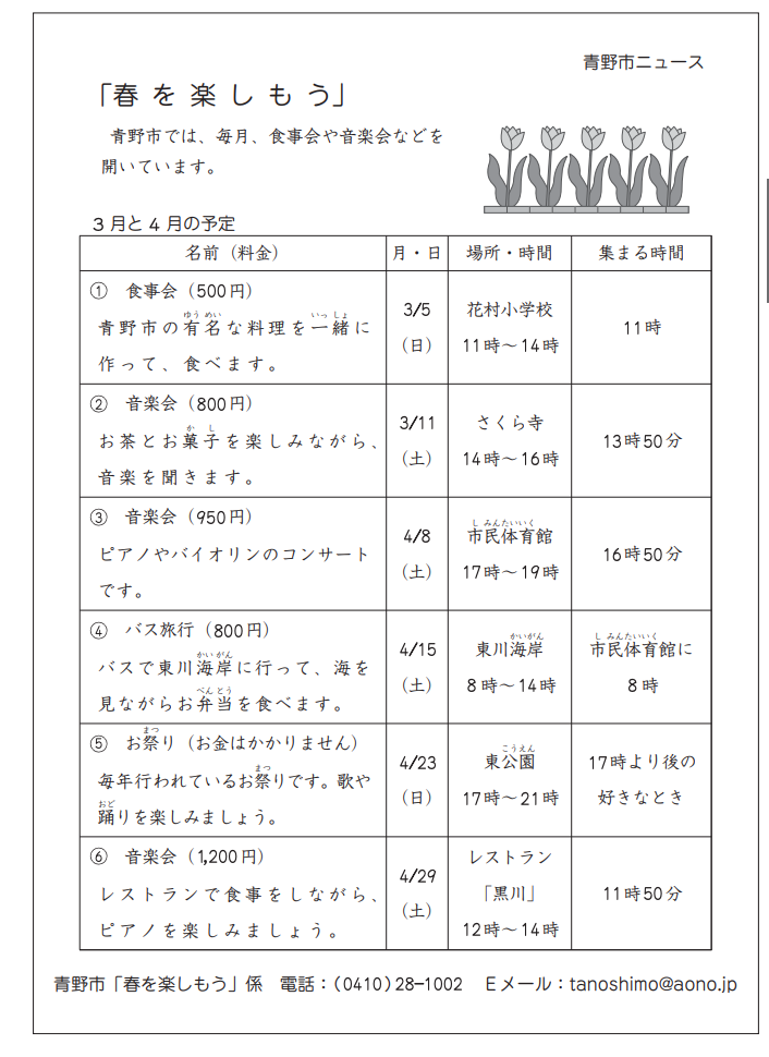 ジーナさんは、「春を楽しもう」に行こうと思っています。土曜日に行きたいですが、集まる時間が13時より早いものには行けません。料金は1000円以下がいいです。ジーナさんが選べるのは、どれですか。