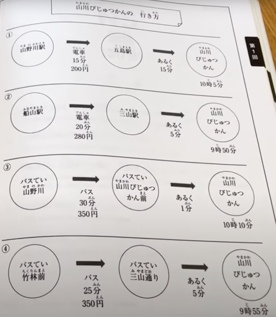 アンさんは 山川びじゅつかんへ 行きたいです。 電車か バスに のって、 10時までに 行きたいです。 電車や バスは 安い ほうが いです。アンさんは どの 行き方で 行きますか。