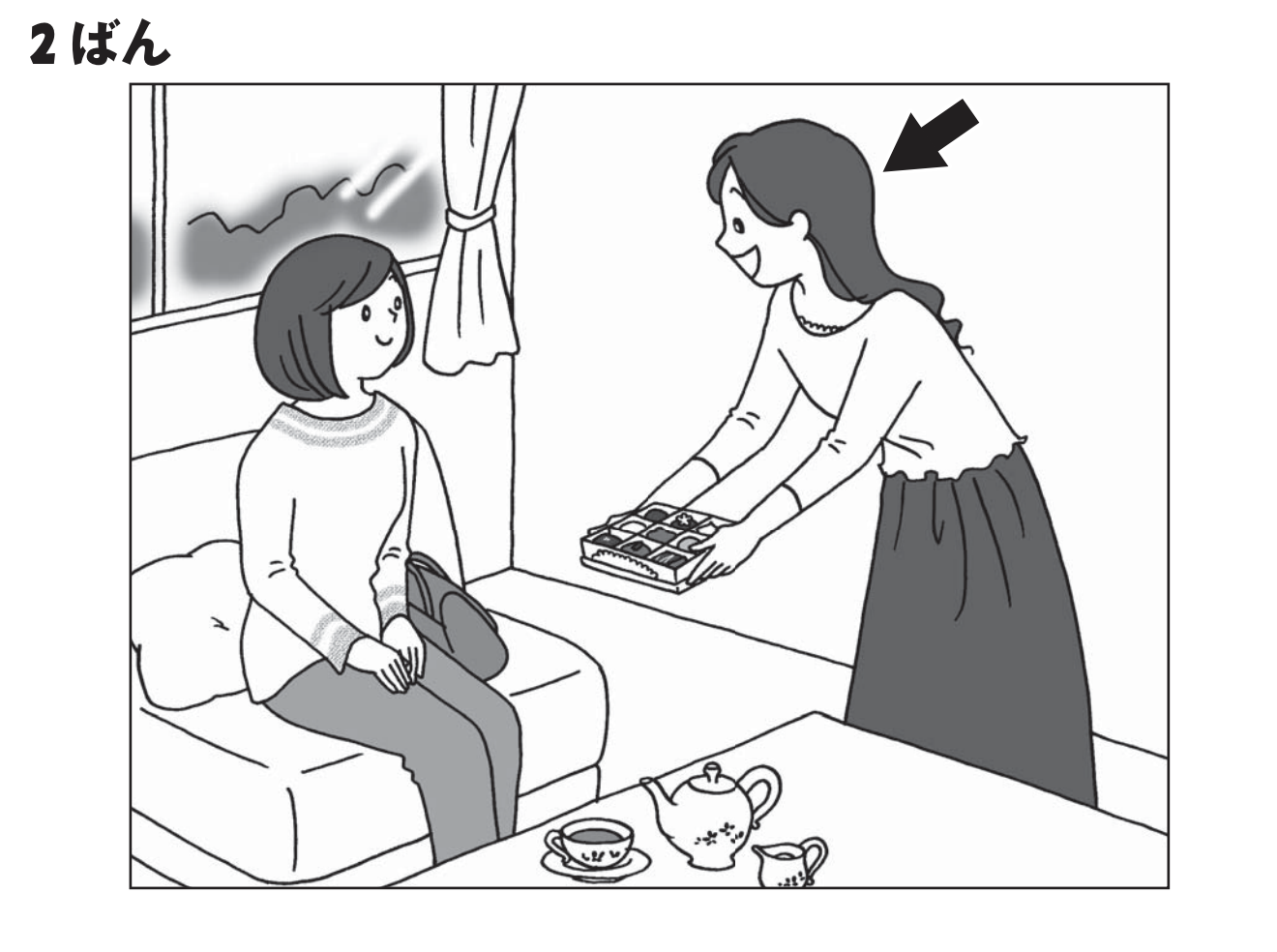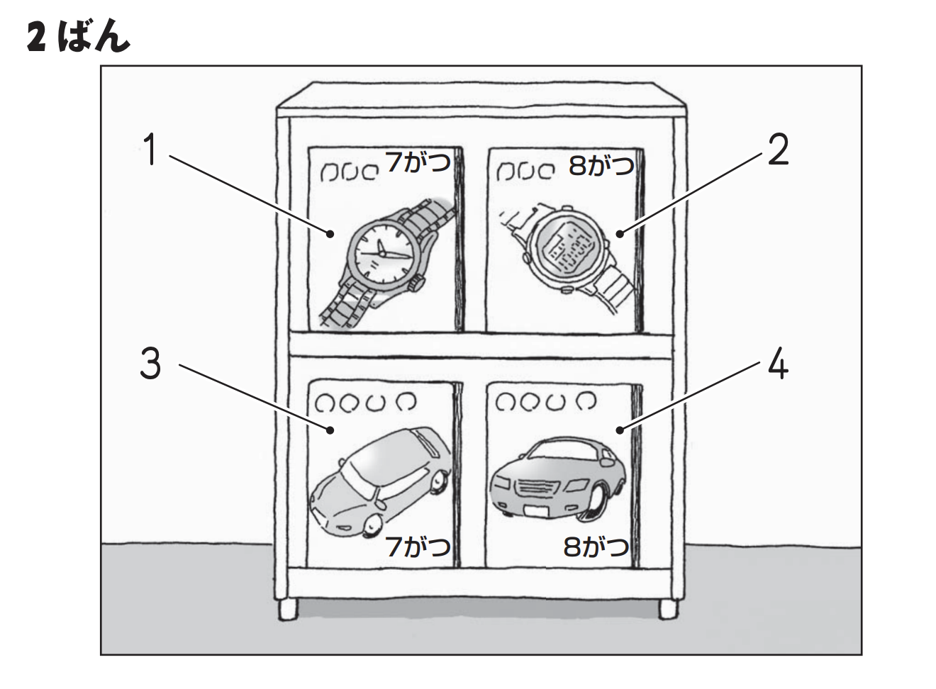 問題2では、まず質問を聞いてください。そのあと、問題用紙を見てください。 読む時間があります。それから話を聞いて、問題用紙の1から4の中から、最もよいものを一つ選んでください